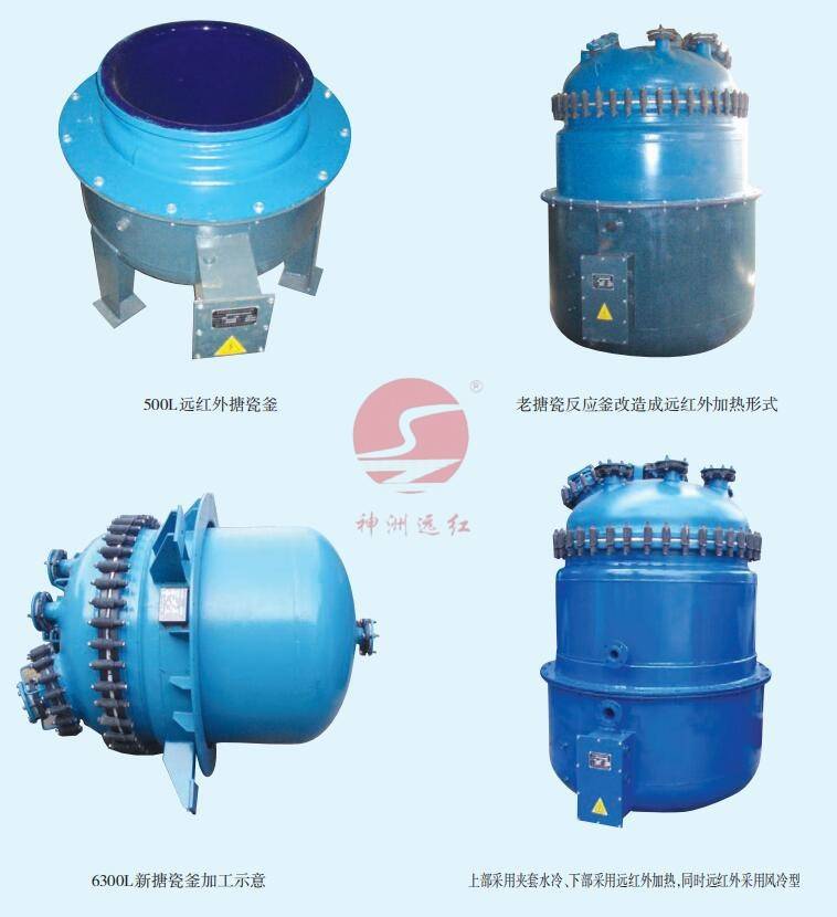 T/GF-M型搪瓷釜用远红外加热系列装置主要对”搪瓷反应釜”加热,T/GF-M型500L/6300L远红外搪瓷反应釜形式配备了降风管,针对反应釜胆内无法安装蛇管降温时而专门设计的 加热结构形式,在加热装置外部上、下各安装一对进出风口,通过鼓风机将室外空气抽进到加热装置内,再通过出风口将加热装 置内部热量排到室外去,可根据物料所需的降温速度配套相应功率的鼓风机和风管口径,其降温形式既起到降温效果,同时又 起到防止过热保护搪瓷的作用,鼓风机开关可与温控柜连锁控制