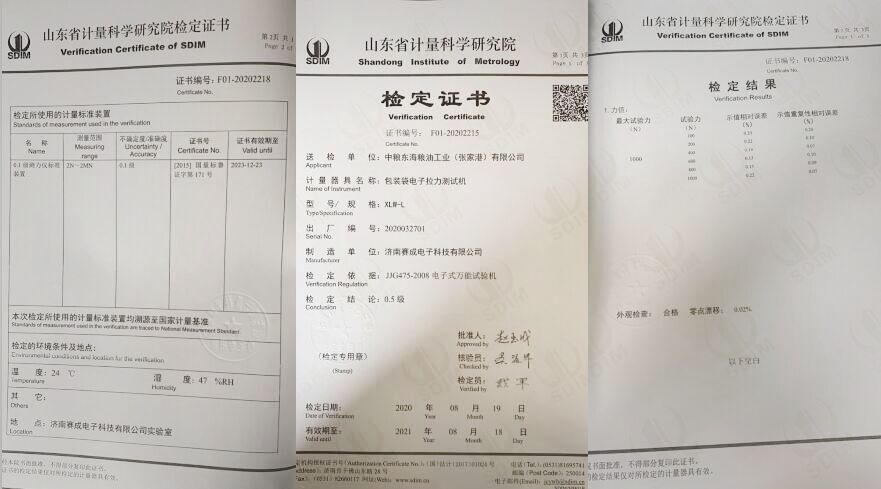为了更好的交付这批设备,确保设备测试数据的准确性,济南赛成仪器向山东省计量科学研究院提出了检定申请。依据JJG475-2008电子式万能试验机的检定规程,省计量院工作人员对XLW-L包装袋电子拉力试验机的精度和误差等进行了检定,经检定结论达到0.5级,检定结果合格。2020年8月9日获得山东省计量科学研究院颁发的检定证书,获得的这份检定证书,进一步证明了济南赛成仪器符合预定要求和质量要求,测量结果准确,仪器持续可靠,性能稳定。